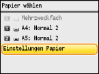 Wenn der Bildschirm <Papier wählen> unten erscheint, wählen Sie mit / die Option <Einstellungen Papier>, und drücken Sie .