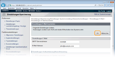 Nach dem Klicken auf [OK] in Schritt 6 werden alle E-Mails im Posteingang auf dem Server gelöscht. Wenn Sie in [E-Mail-Adresse] eine E-Mail-Adresse für den täglichen Gebrauch angegeben haben, achten Sie darauf, keine ungelesenen E-Mails zu löschen. Verwenden Sie ein eigenes E-Mail-Konto für das Gerät, um die Gefahr zu verringern, dass ungelesene E-Mails gelöscht werden.